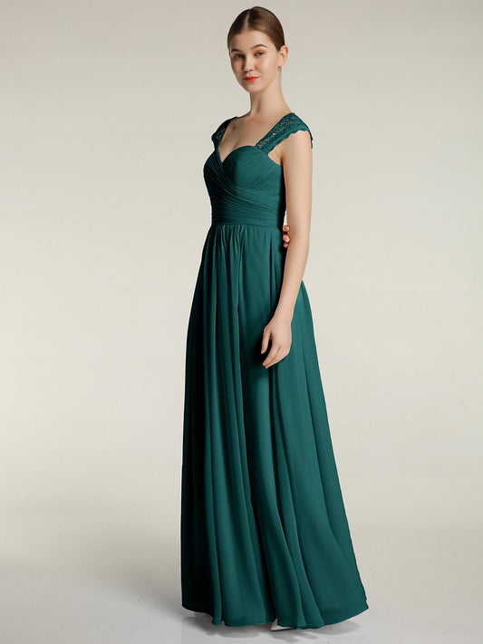 Babaroni HelenVestidos de chiffon con escote en corazón y mangas cap de encaje Pavo real