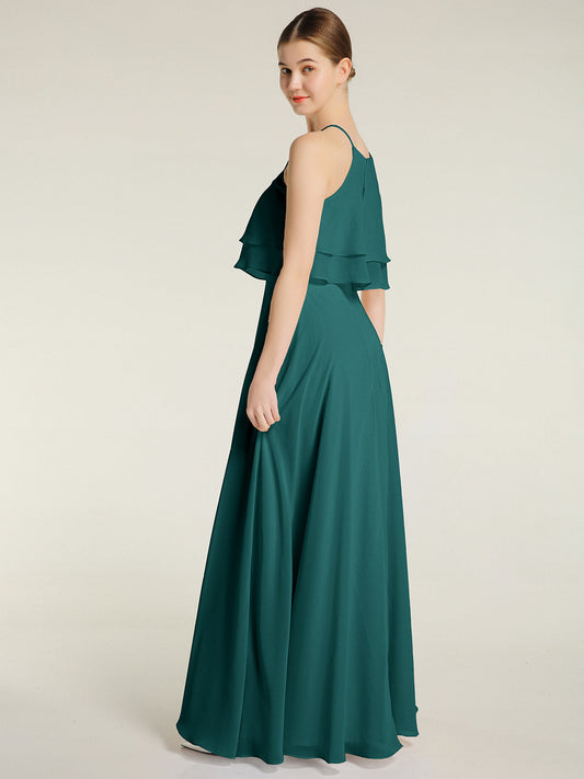 Babaroni AmyVestidos largos de dama de honor de chiffon con tirantes de cuello halter Pavo real