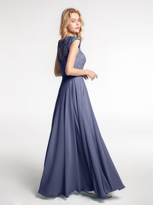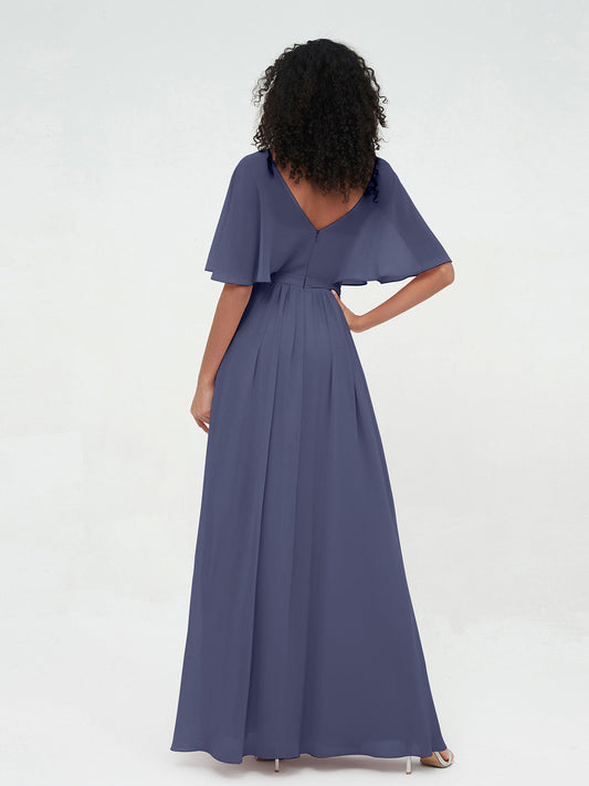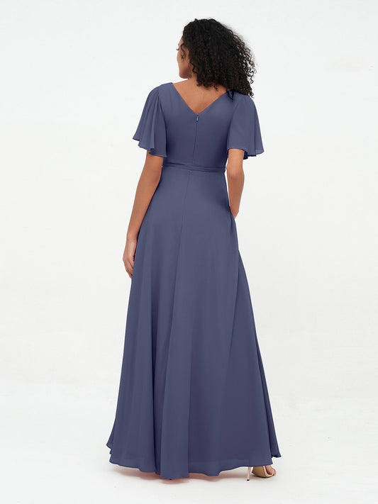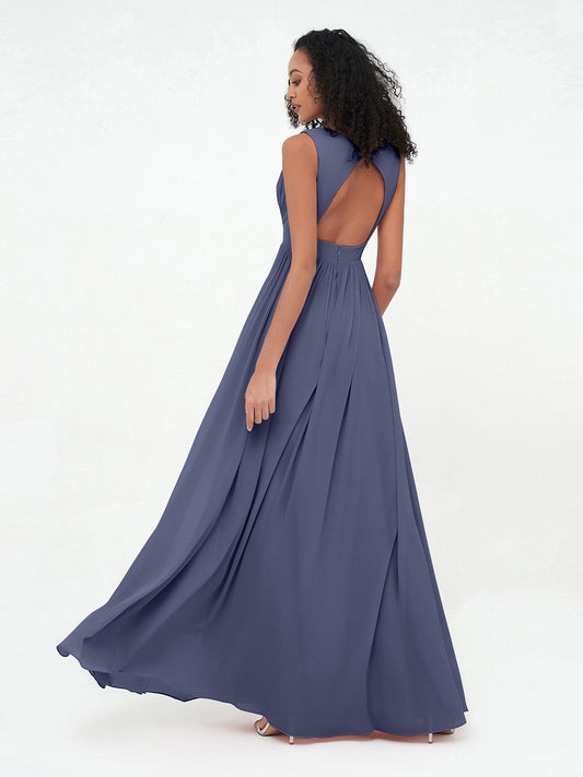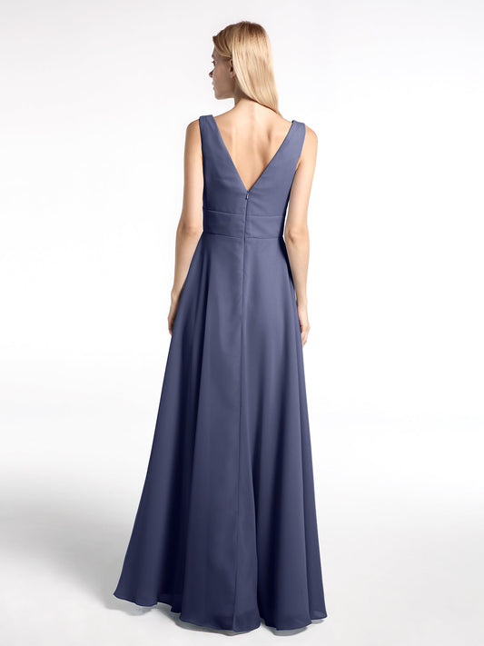 Babaroni SibylVestido largo de chiffon sencillo con escote en forma de muesca Tormenta