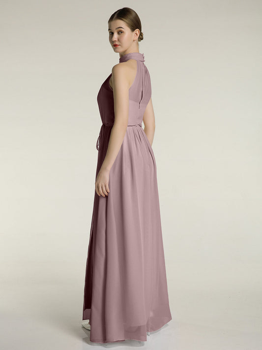 Babaroni KimiVestidos de chiffon de cuello alto con abertura y lazo de cinturón Malva Vintage