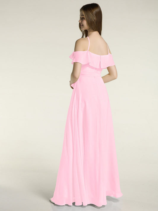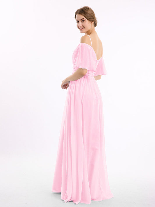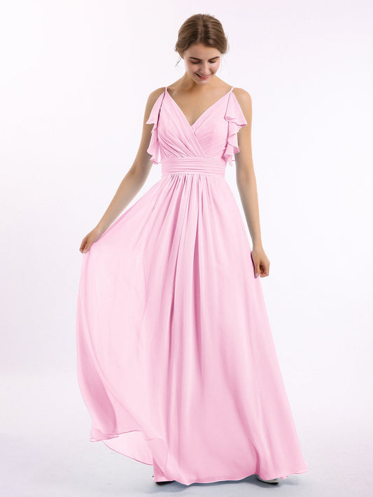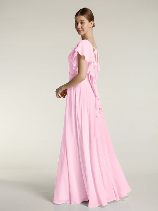 Babaroni RosaVestidos largos de dama de honor de chiffon con escote en Y y mangas de volantes Rosa Chicle