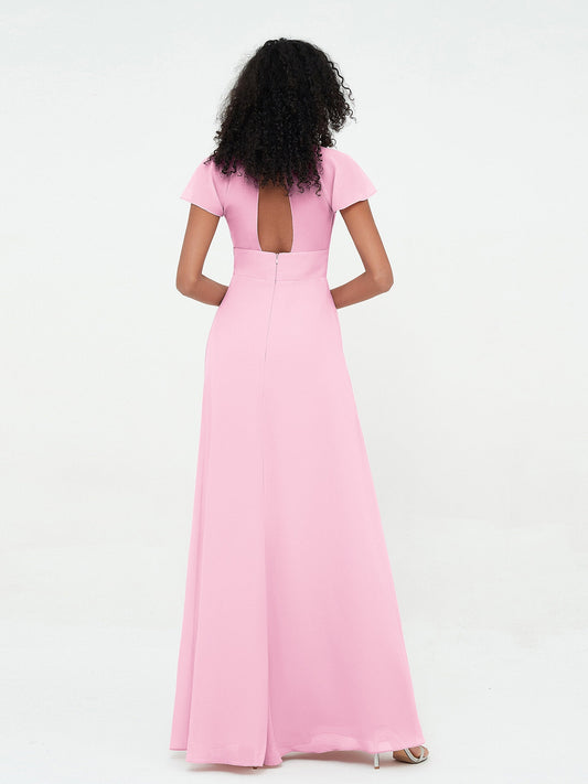 Babaroni SallyVestidos de dama de honor de chiffon con mangas cap y abertura Rosa Chicle
