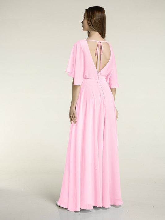 Babaroni MignonVestidos largos de dama de honor de chiffon con mangas de volantes Rosa Chicle