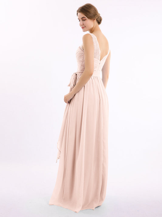 Vestidos largos de chiffon con tirantes de encaje y lazo de cinturón Rosa perlado