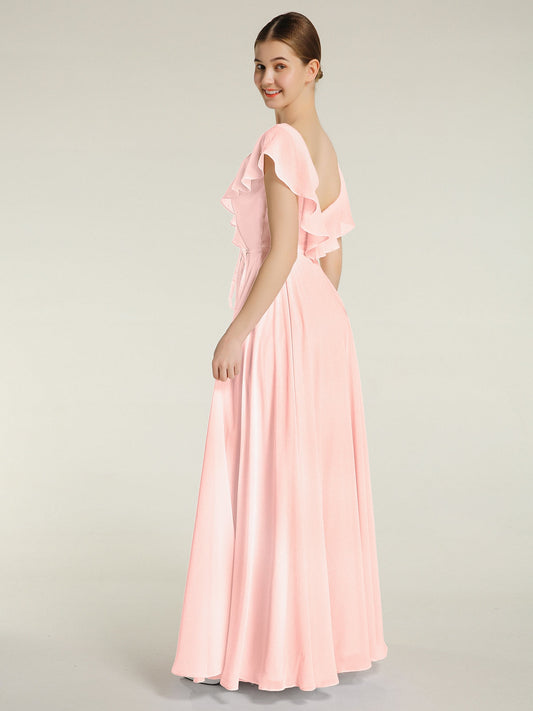 Vestidos largos de chiffon con mangas cap y abertura Rosa perlado