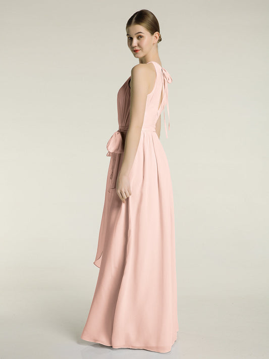 Babaroni JaneVestidos largos de chiffon estilo halter con lazo Rosa perlado