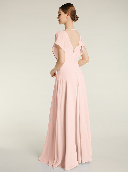 Babaroni GemmaVestidos largos de chiffon con mangas cap y abertura Rosa perlado
