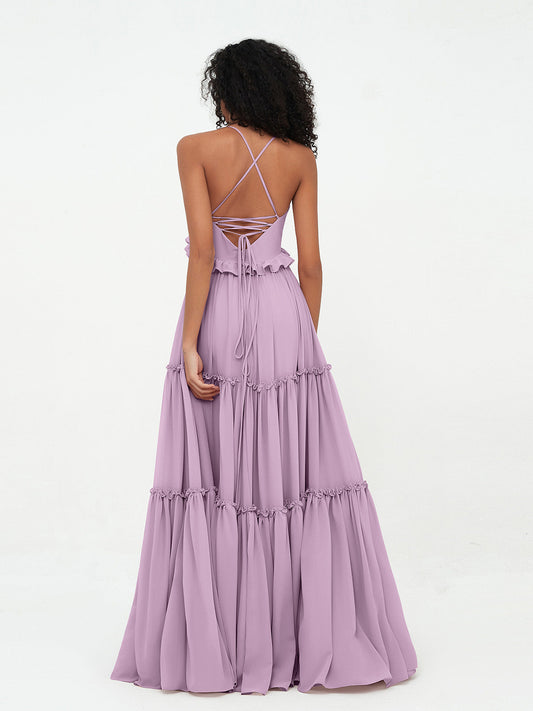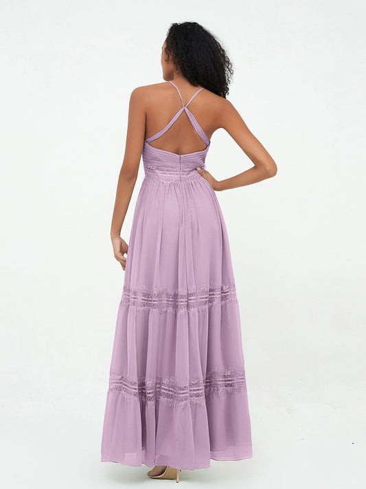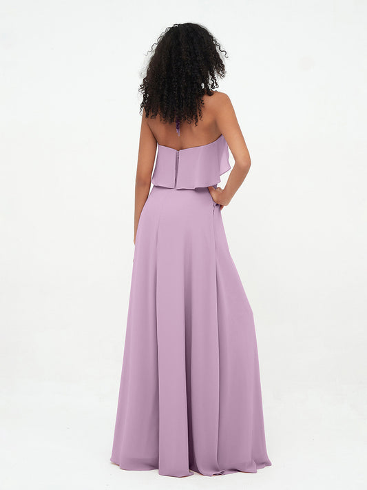 Vestidos largos de dama de honor de chiffon con tirantes de cuello halter Wisteria