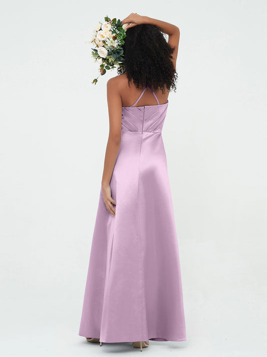 Vestidos máximos de satén estilo A-line con cuello halter y bolsillos Wisteria