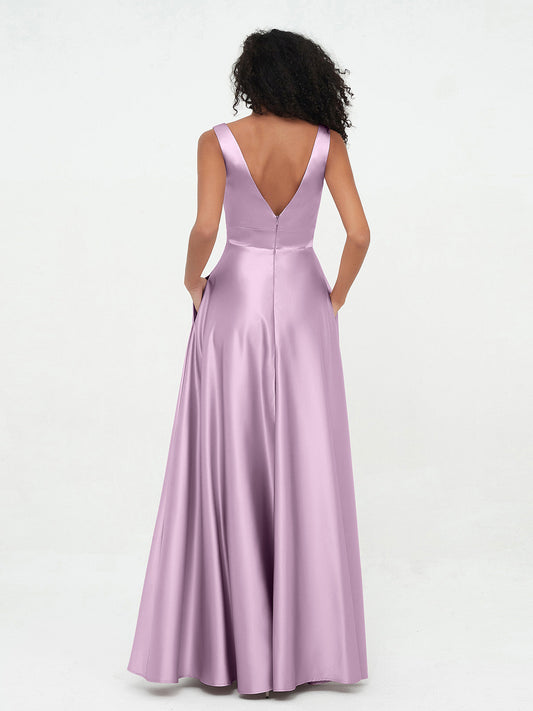 Vestidos máximos de satén estilo princesa con escote en V y bolsillos Wisteria