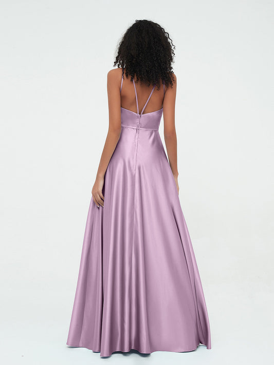 Vestidos largos de satén con tirantes spaghetti y cuerpo plisado Wisteria
