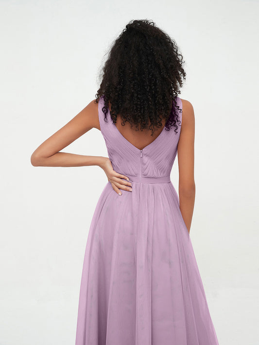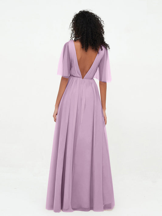 Babaroni KatherineVestidos máximos de tul estilo A-line con escote en V profundo en la espalda Wisteria