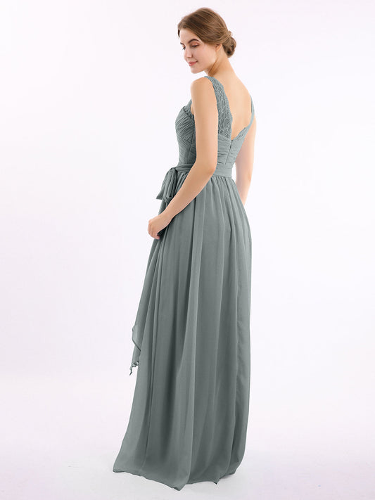 Babaroni LindaVestidos largos de chiffon con tirantes de encaje y lazo de cinturón Gris Acero
