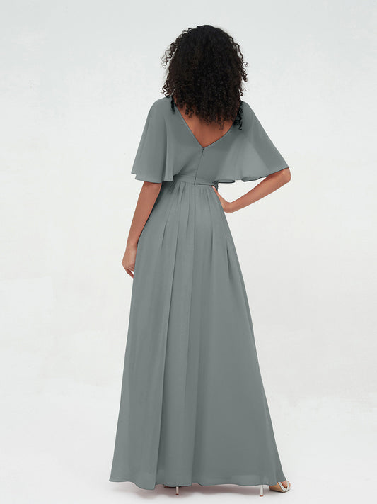 Babaroni UnaVestidos máximos de chiffon con escote en V profundo y mangas 1/2 Gris Acero