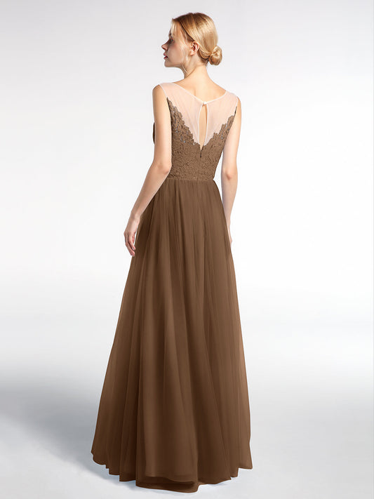 Babaroni PamelaVestido maxi de encaje y tul con escote ilusión Marrón