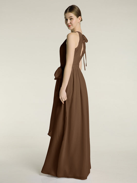 Babaroni MariaVestidos largos de chiffon de cuello en Y para damas de honor Marrón