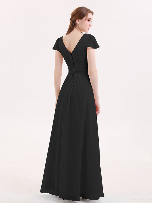Babaroni JacquelineJacqueline Largo Gasa Vestido De Dama De Honor Con Mangas De La Tapa Negro
