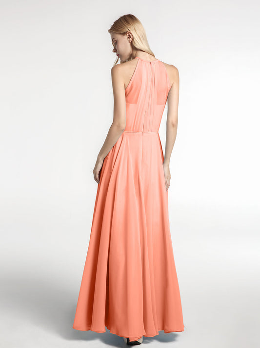 Vestidos largos de dama de honor de chiffon con tirantes de cuello halter Atardecer