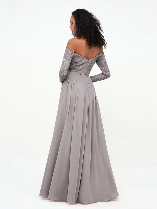 Babaroni JoannaVestidos largos de encaje con mangas largas y hombros descubiertos Plata