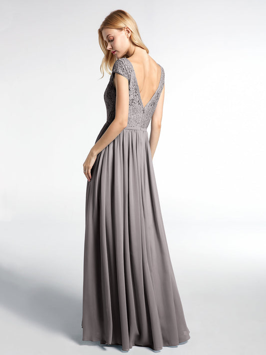 Babaroni LaraineVestido maxi con cuerpo de encaje y falda de chiffon con escote en V Plata