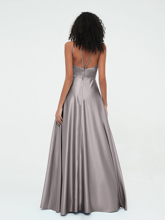 Babaroni MyrnaVestidos máximos de satén estilo A-line con tirantes spaghetti Plata