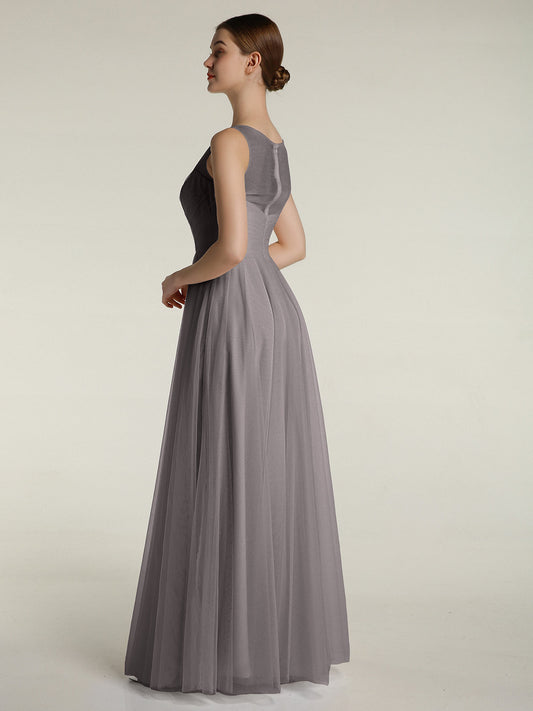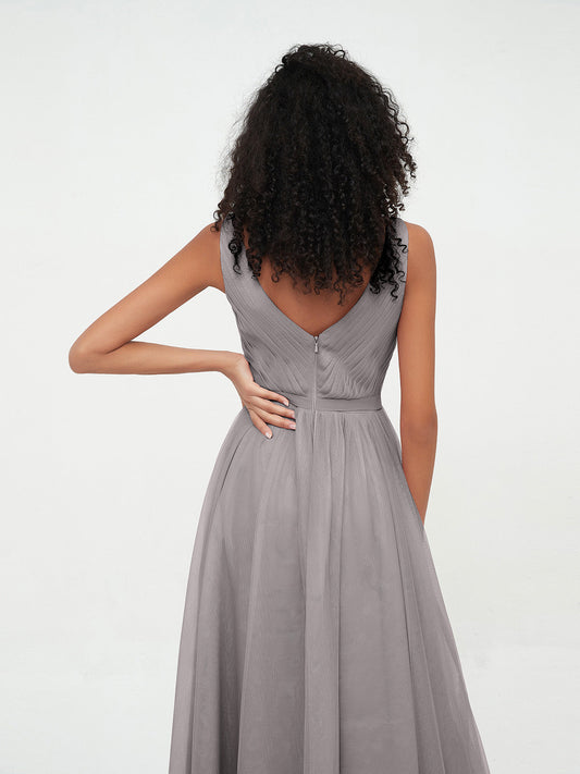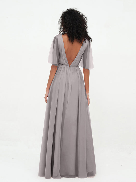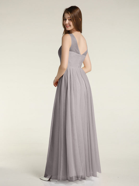 Vestidos máximos de tul estilo A-line con escote en V profundo en la espalda Plata
