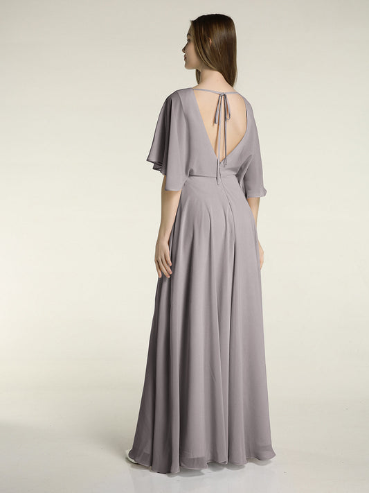 Vestidos largos de dama de honor de chiffon con mangas de volantes Plata