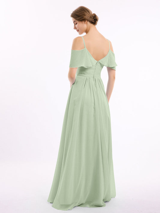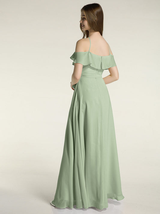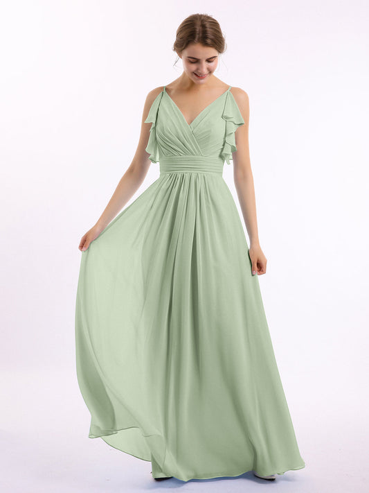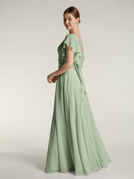 Babaroni RosaVestidos largos de dama de honor de chiffon con escote en Y y mangas de volantes Salvia polvorienta
