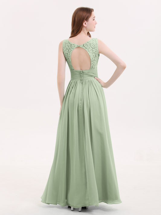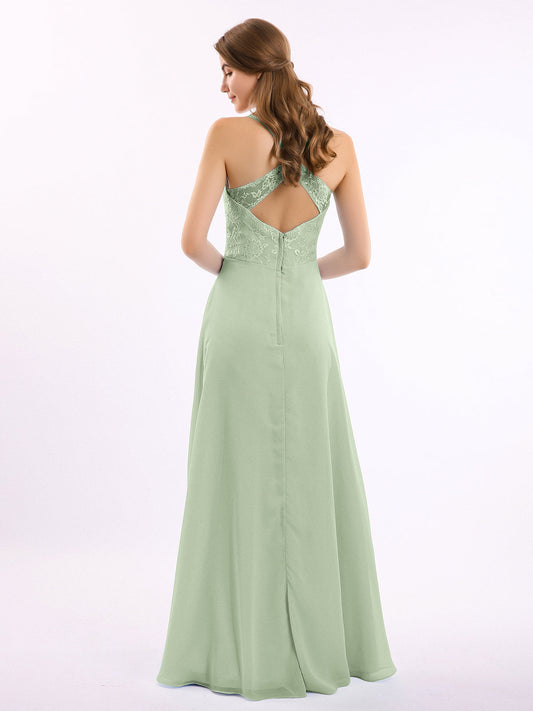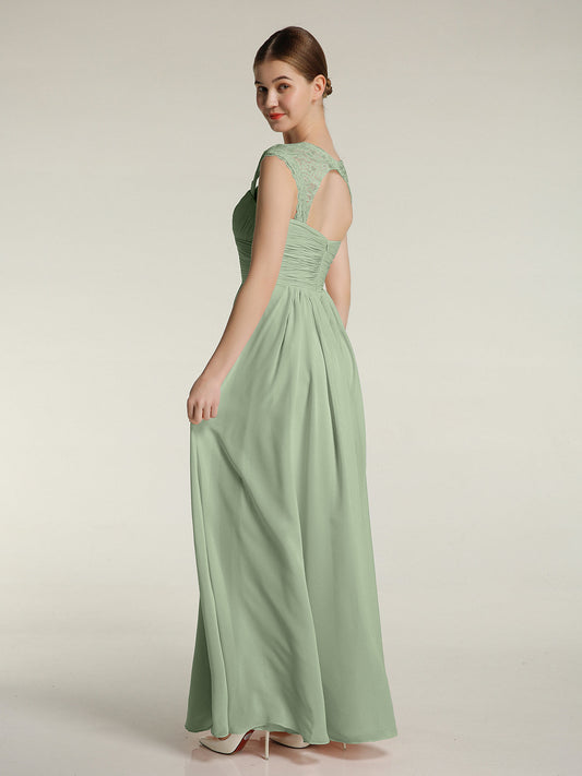 Babaroni LucilleVestidos largos de chiffon con encaje en escote en V profundo y espalda descubierta Salvia polvorienta
