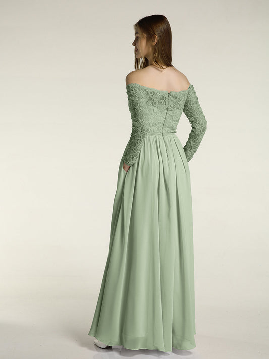 Babaroni MeilaniVestidos de encaje y chiffon con mangas largas y bolsillos Salvia polvorienta