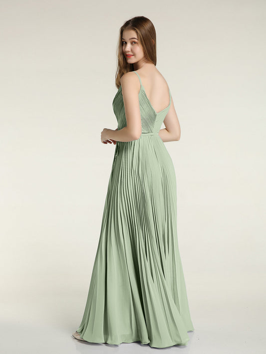 Babaroni MaudSencillos vestidos largos de chiffon con tirantes finos y abertura Salvia polvorienta