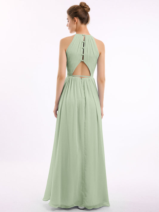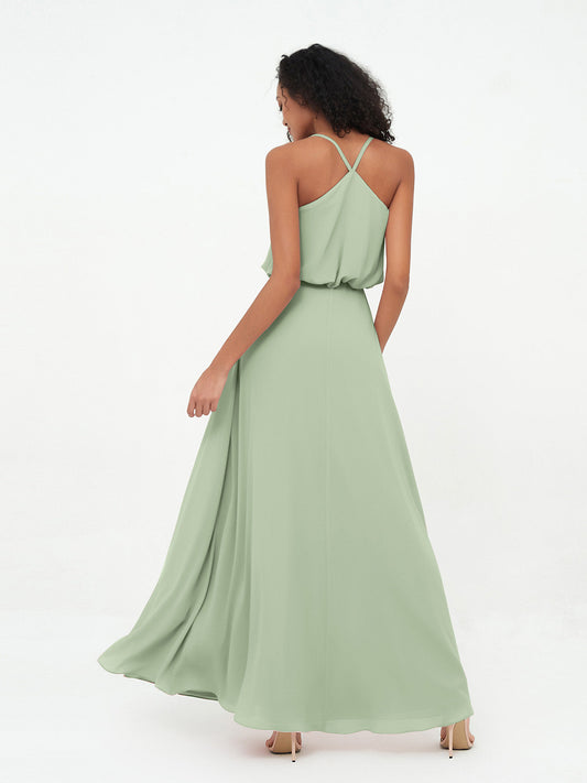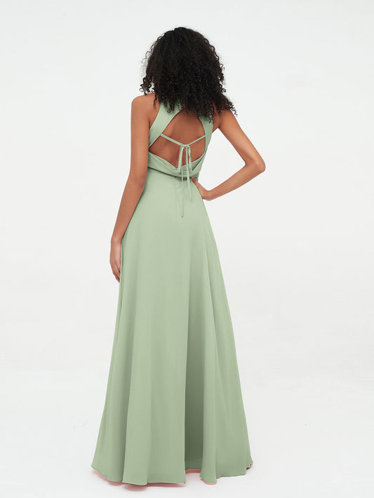 Vestidos largos de chiffon estilo halter con espalda descubierta Salvia polvorienta
