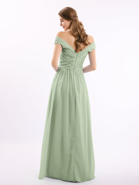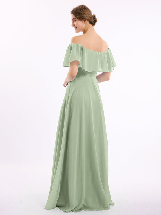 Vestido largo de chiffon con hombros descubiertos Salvia polvorienta