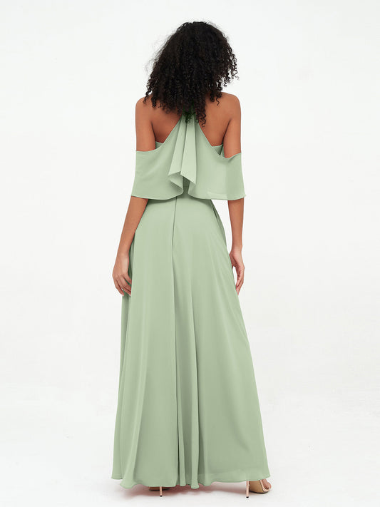 Vestidos máximos de chiffon estilo halter con hombros descubiertos Salvia polvorienta