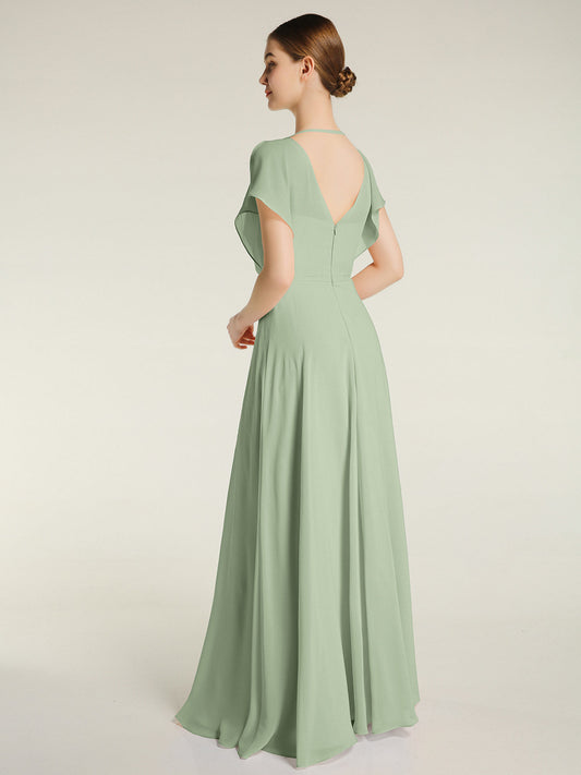Babaroni GemmaVestidos largos de chiffon con mangas cap y abertura Salvia polvorienta