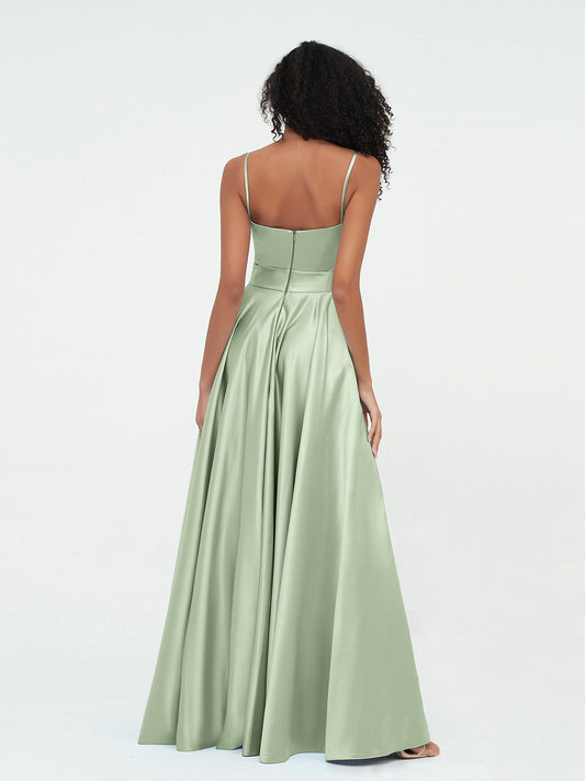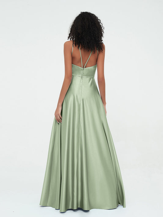 Babaroni MyrnaVestidos máximos de satén estilo A-line con tirantes spaghetti Salvia polvorienta