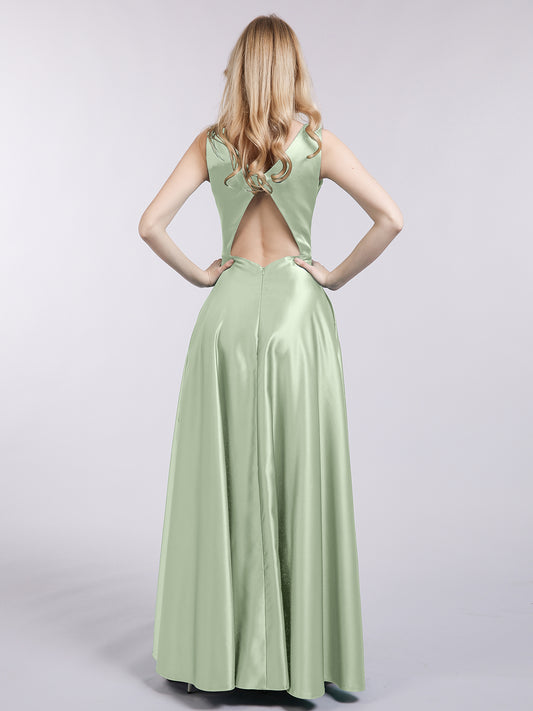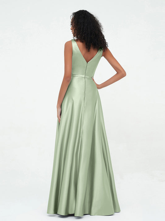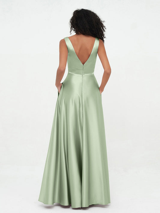Babaroni SadeVestidos máximos de satén estilo princesa con escote en V y bolsillos Salvia polvorienta