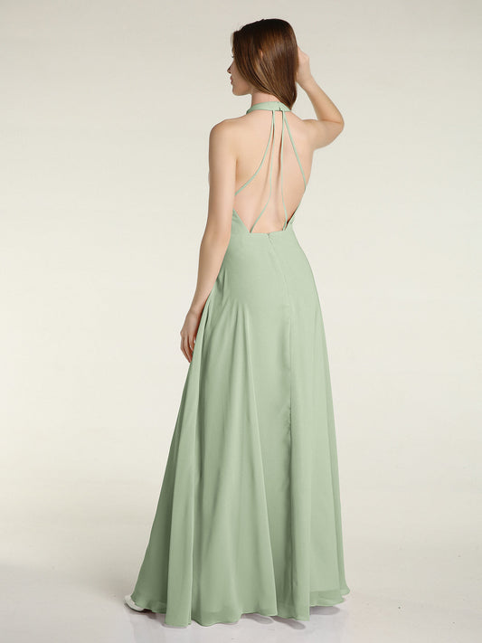 Babaroni CynthiaVestidos largos de chiffon estilo halter con espalda descubierta Salvia polvorienta