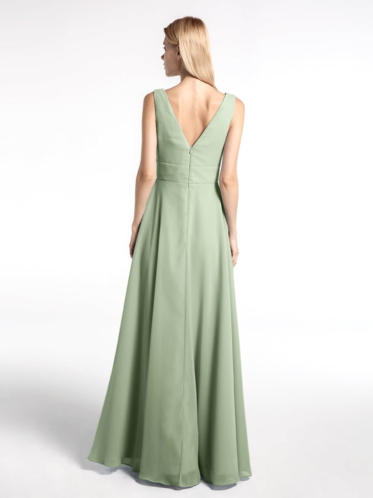 Babaroni SibylVestido largo de chiffon sencillo con escote en forma de muesca Salvia polvorienta