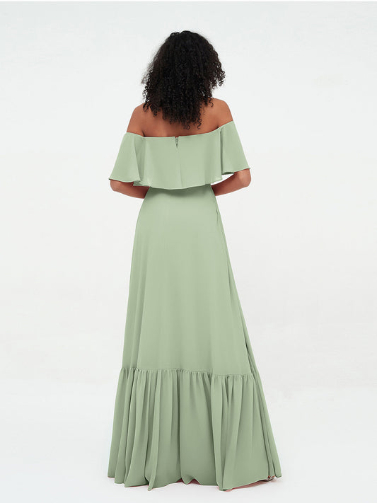 Babaroni VirginiaVestidos máximos de chiffon con falda escalonada estilo off shoulder Salvia polvorienta