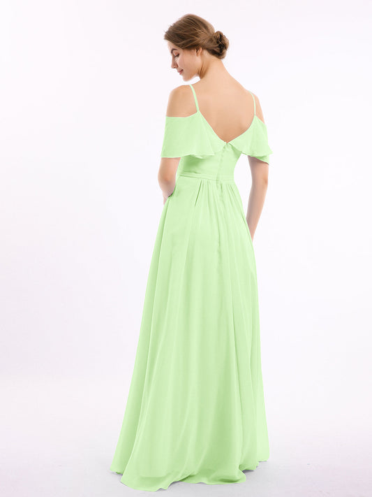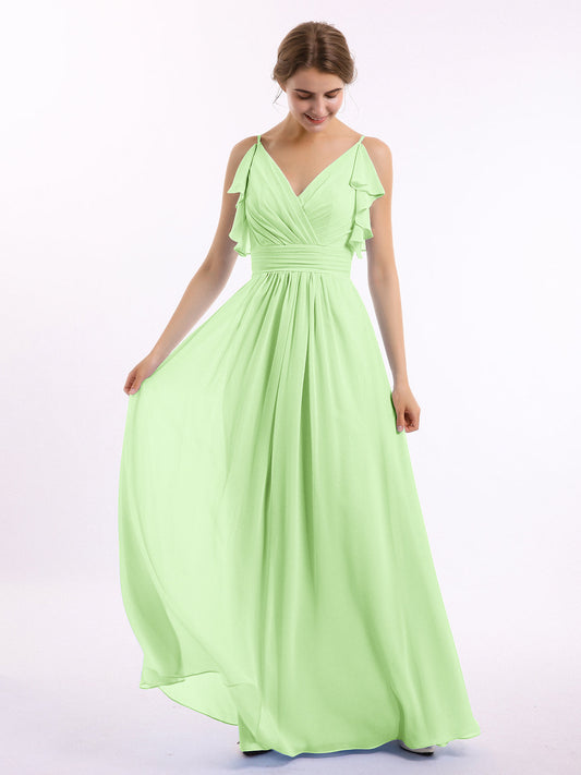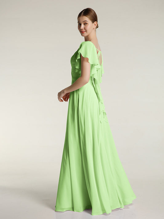 Babaroni RosaVestidos largos de dama de honor de chiffon con escote en Y y mangas de volantes Salvia