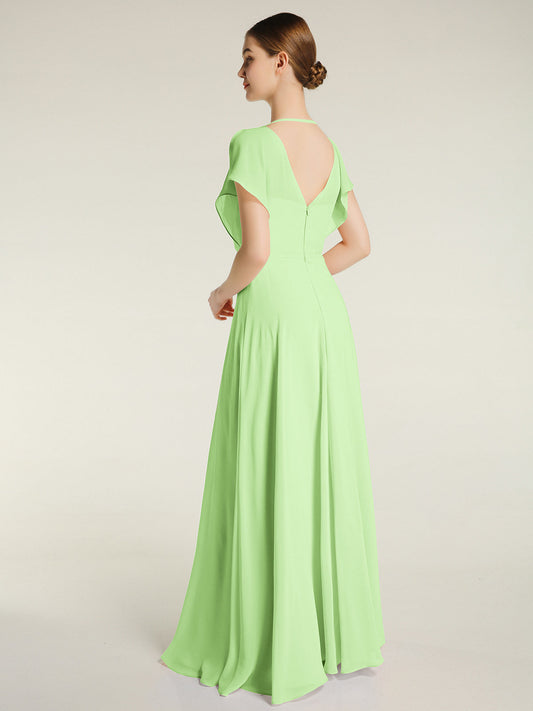 Babaroni GemmaVestidos largos de chiffon con mangas cap y abertura Salvia
