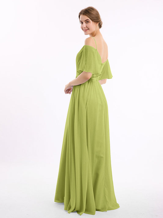 Babaroni RosaVestidos largos de dama de honor de chiffon con escote en Y y mangas de volantes Trébol