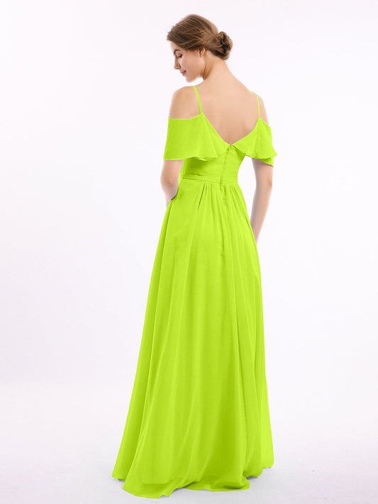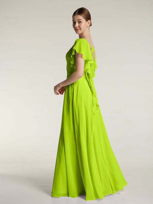 Babaroni RosaVestidos largos de dama de honor de chiffon con escote en Y y mangas de volantes Verde Lima