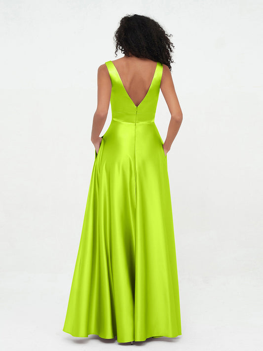 Babaroni SadeVestidos máximos de satén estilo princesa con escote en V y bolsillos Verde Lima