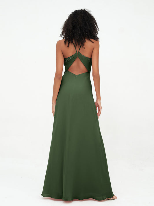 Vestidos de halter con top de encaje y espalda descubierta de gasa Verde Oliva
