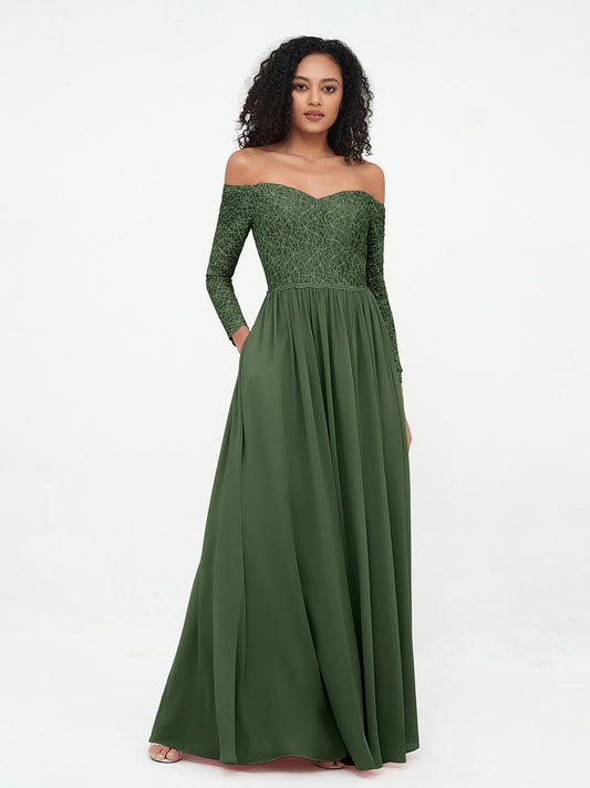 Vestidos largos de encaje con mangas largas y hombros descubiertos Verde Oliva