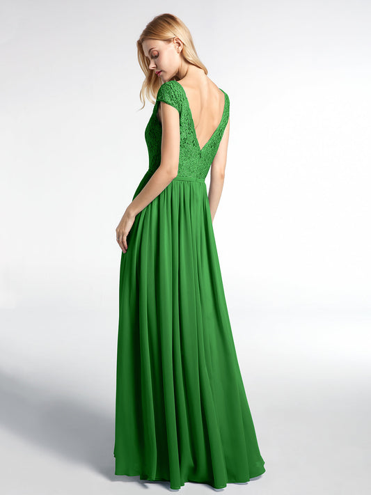 Vestido maxi con cuerpo de encaje y falda de chiffon con escote en V Verde