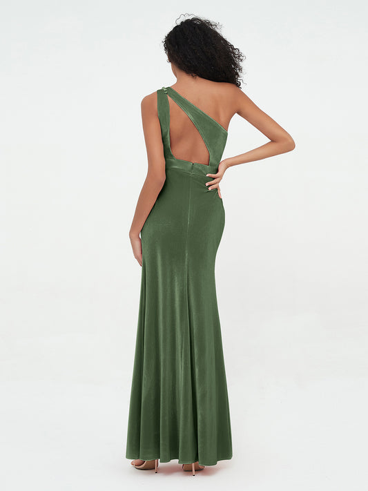 Babaroni DawnVestidos de terciopelo de un hombro con espalda abierta y abertura Verde Oliva