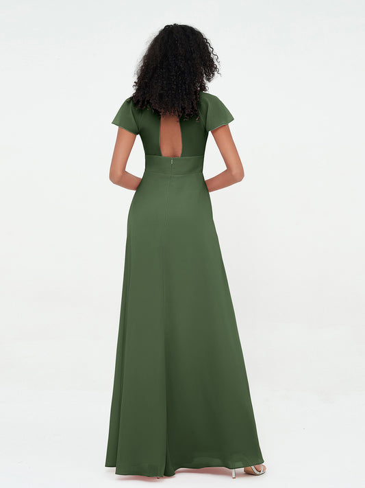 Babaroni SallyVestidos de dama de honor de chiffon con mangas cap y abertura Verde Oliva